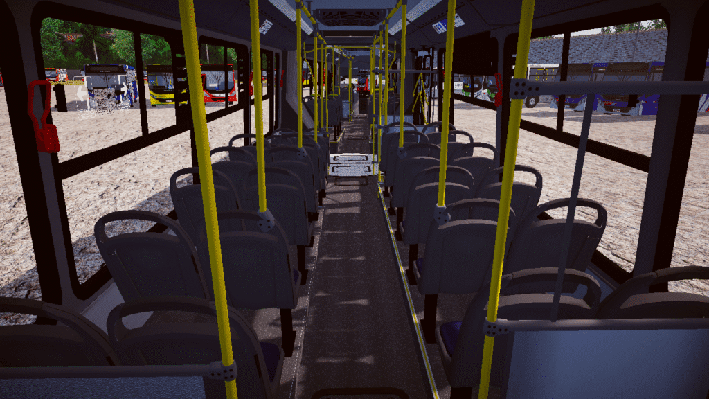 Interior moderno e completo, com bancos, piso, barras de apoio, cabine do motorista e painel funcional.