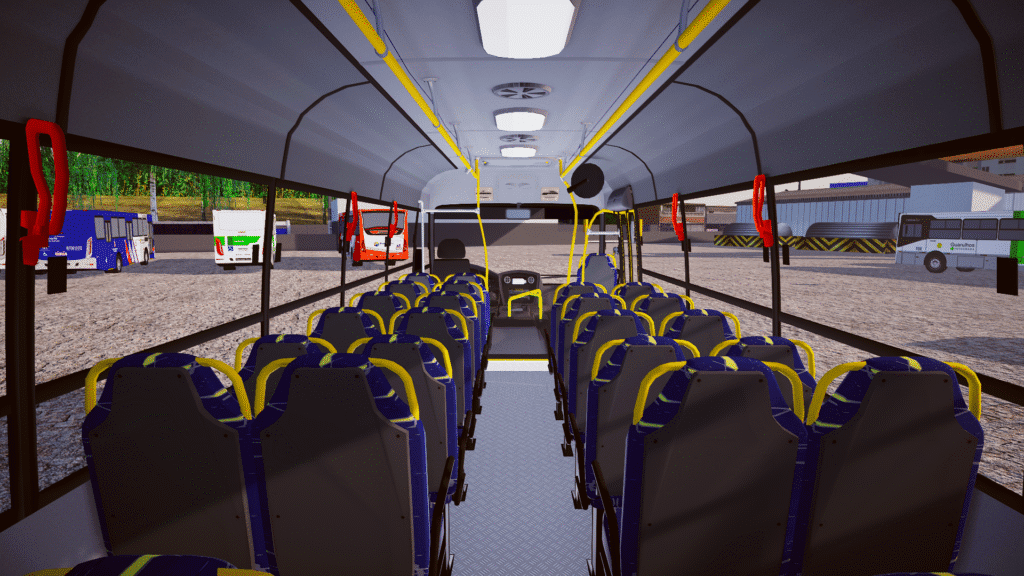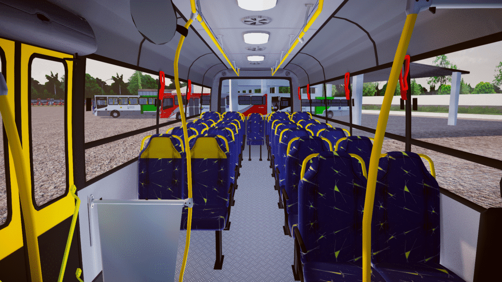 Fotos internas do veículo: sendo painel, identificação de veículo e empresa, além do salão de passageiros com validadores reais e com animação no padrão Escolar.