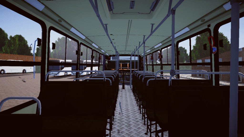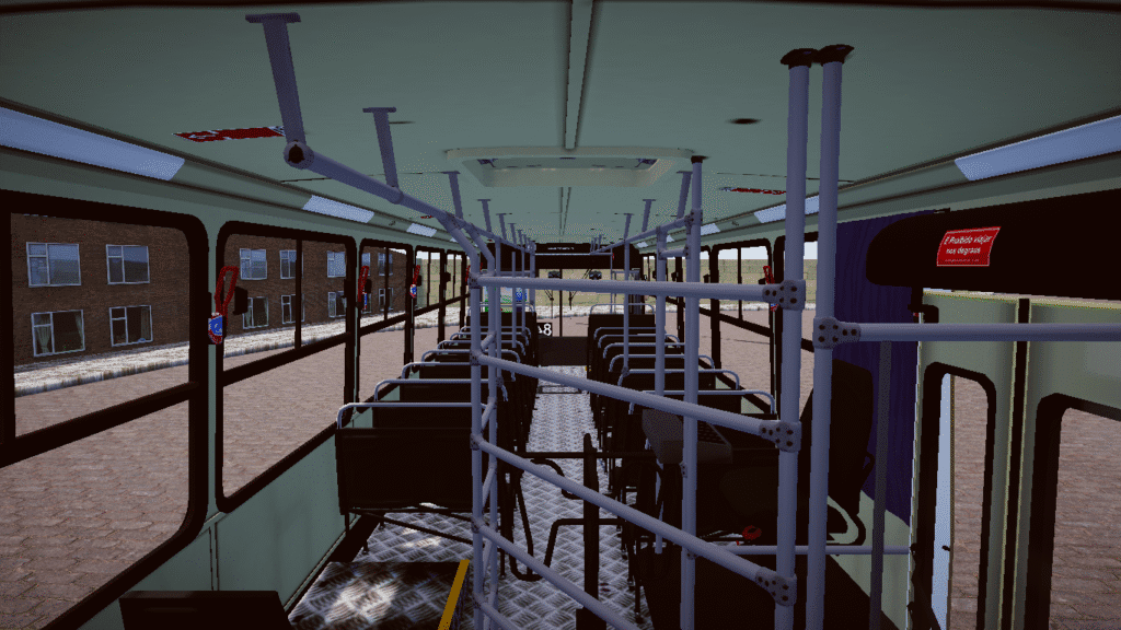 Interior completo, com bancos, barras de apoio, catraca, cabine do motorista e painel funcional.