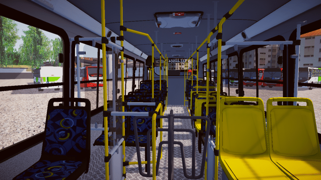 Interior completo e funcional, com bancos urbanos, barras de apoio, catraca, cabine do motorista e painel detalhado.