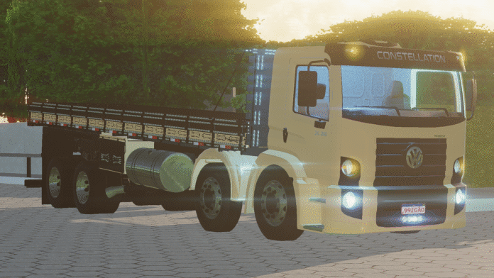 O modelo apresenta visual externo bem detalhado, cabine moderna baseada na linha Constellation e acabamento interno funcional, garantindo maior imersão durante a condução. A física foi ajustada para simular o comportamento de um caminhão bitruck real, com boa estabilidade, aceleração progressiva e sons característicos do motor.