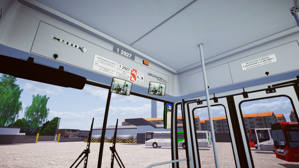 Fotos internas do veículo: sendo painel, identificação de veículo e empresa, além do salão de passageiros com validadores reais e com animação para o padrão SPTrans/SP.