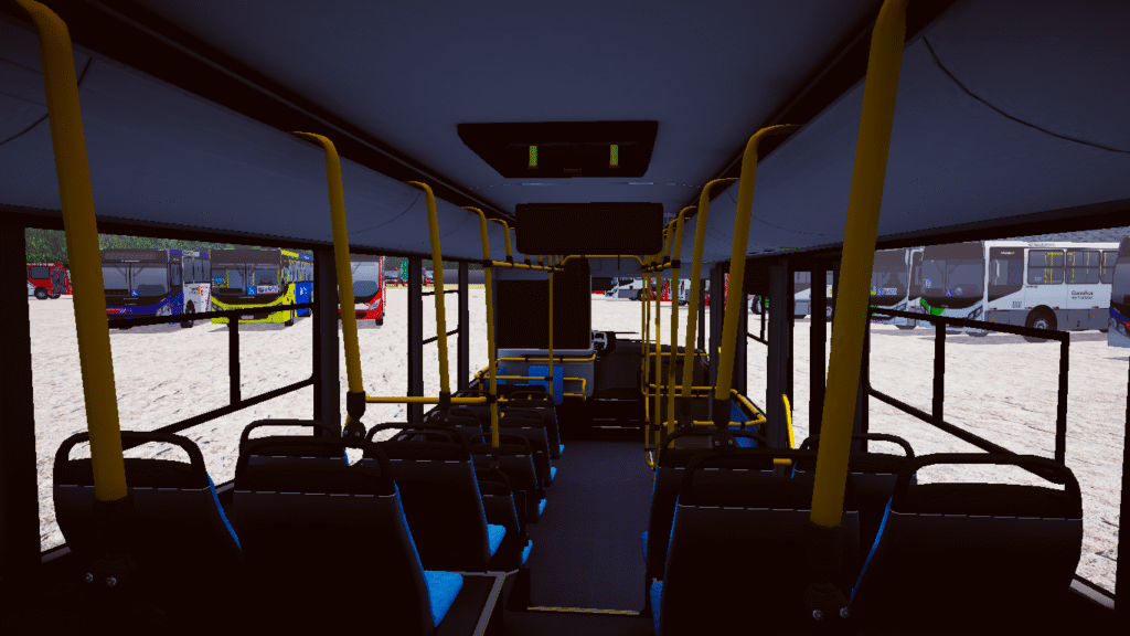 Fotos internas do veículo: sendo painel, identificação de veículo e empresa, além do salão de passageiros com validadores reais e com animação.