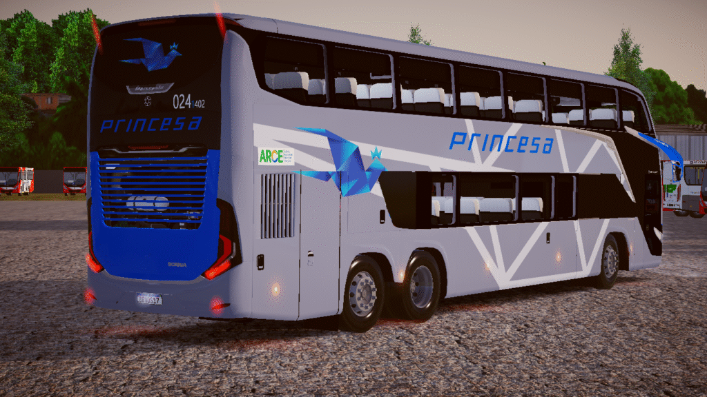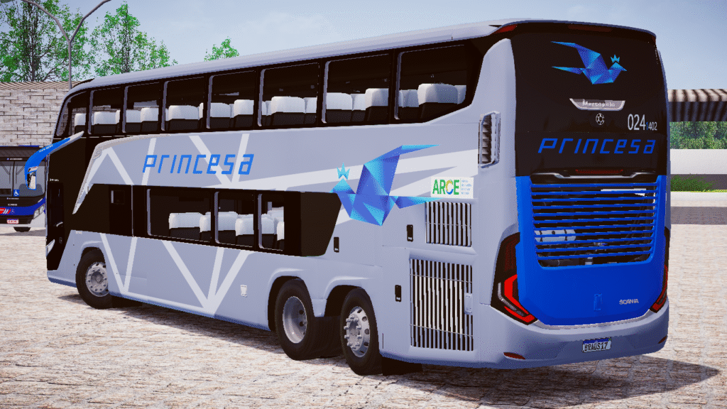 Com configuração Double Decker (DD) e excelente desempenho proporcionado pelo conjunto Scania K410C, este modelo é ideal para simulações de viagens interestaduais, turismo premium e linhas de alto padrão dentro do jogo.
