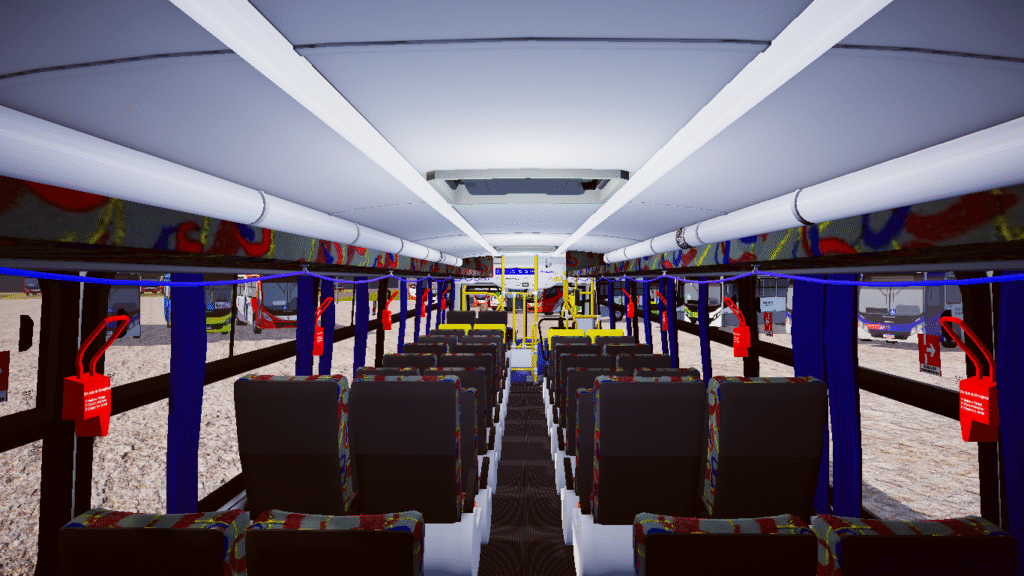 Fotos internas do veículo: sendo painel, identificação de veículo e empresa, além do salão de passageiros com validadores reais e com animação.