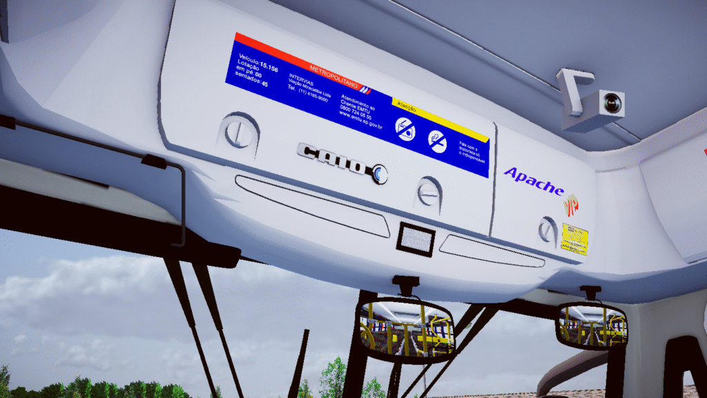 Fotos internas do veículo: sendo painel, identificação de veículo e empresa, além do salão de passageiros com validadores reais e com animação.