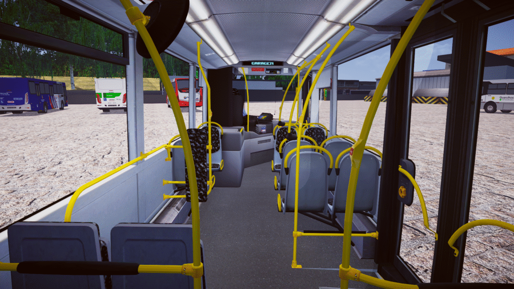 Fotos internas do veículo: sendo painel, identificação de veículo e empresa, além do salão de passageiros com validadores reais e com animação.