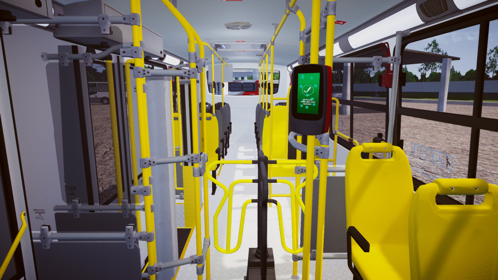 Fotos internas do veículo: sendo painel, identificação de veículo e empresa, além do salão de passageiros com validadores reais e com animação para o padrão Salvador/BA.